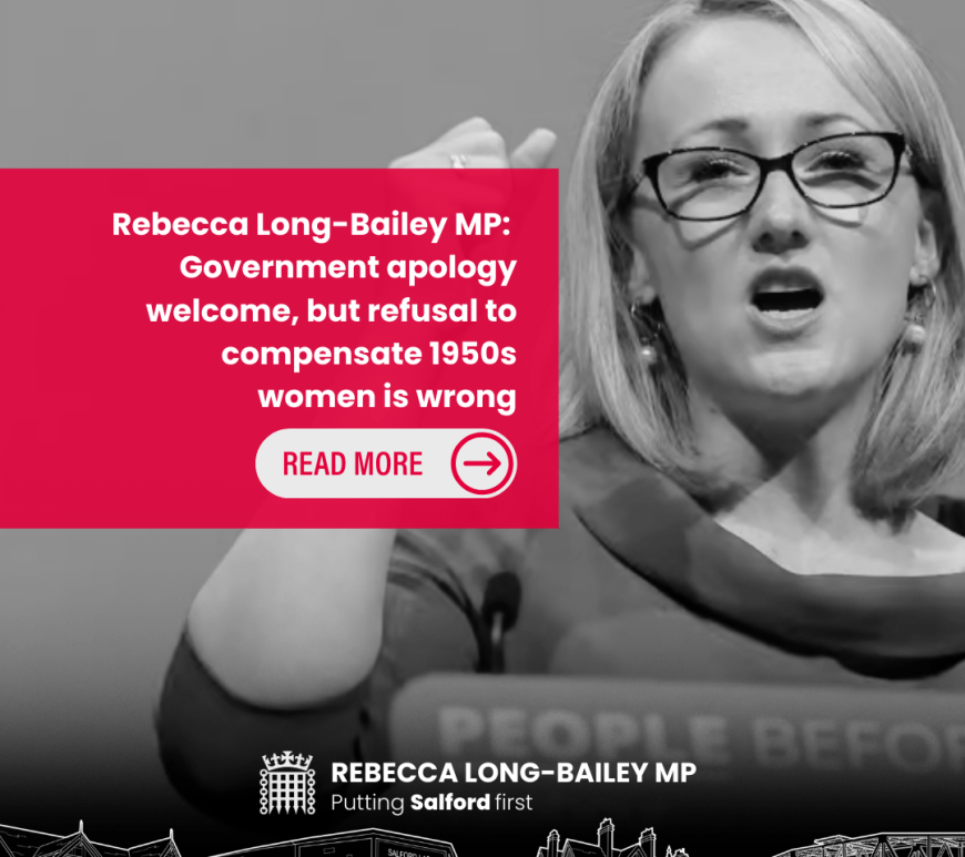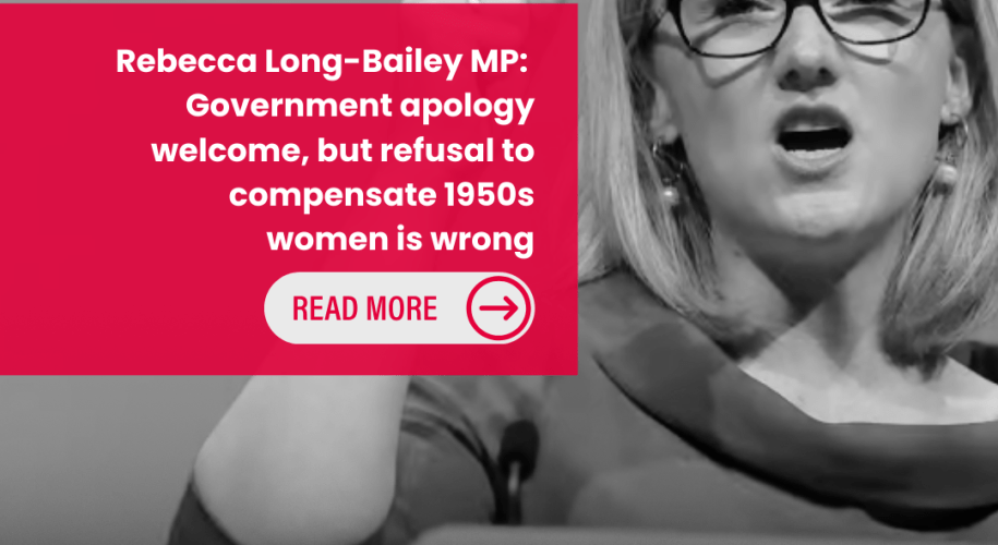 Rebecca Long-Bailey MP, Labour’s Member of Parliament for Salford and Co-Chair of the All-Party Parliamentary Group on State Pension Inequality for Women, has called out the Government’s decision to once again rule out compensation for women born in the 1950s affected by changes to the State Pension age. Following today’s statement to Parliament, Rebecca said that “It is frankly wrong that the Government has once again … Continue reading Rebecca Long-Bailey MP: Government apology welcome, but refusal to compensate 1950s women is wrong