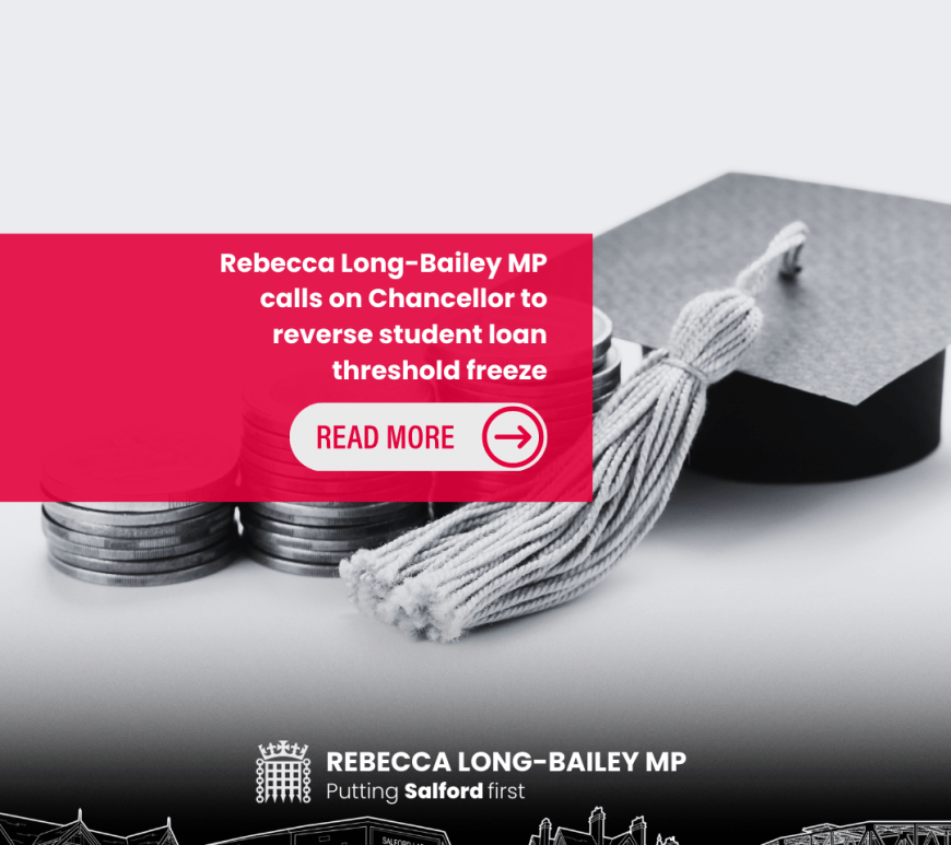 Salford MP, Rebecca Long-Bailey, whilst calling on the Government to develop a sustainable funding model for Higher Education and university research which sees the abolition of tuition fees as a long term goal, is calling on the Chancellor to immediately reverse the three year freeze on the Plan 2 repayment threshold, and to meet with campaigners to implement wider urgent proposals to reform the broken … Continue reading Rebecca Long-Bailey MP calls on Chancellor to reverse student loan threshold freeze