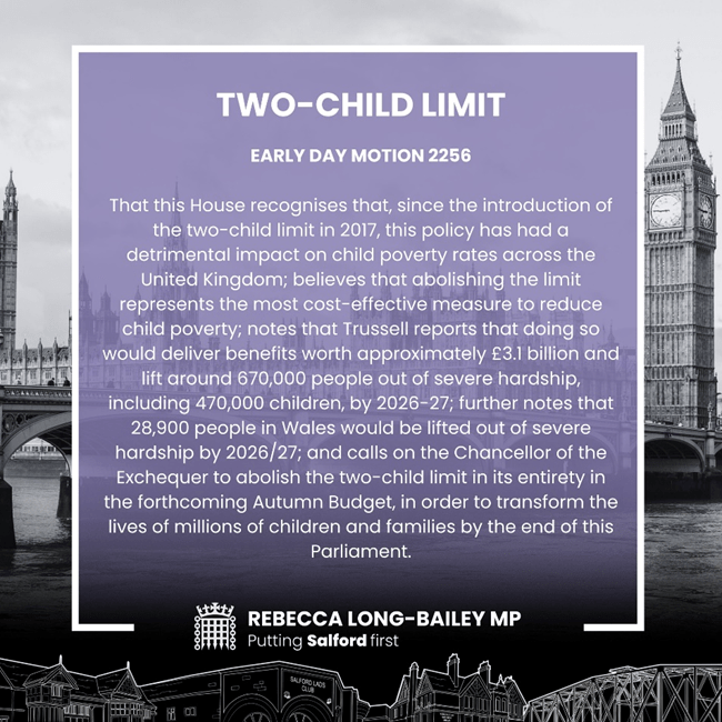 I also joined cross-Party MPs in signing a Parliamentary motion urging the Chancellor to abolish the two-child limit. Ending this cruel policy would lift an estimated 670,000 people, including 470,000 children, out of severe hardship and would transform lives across the UK. I will continue to press for its full abolition so that every child has the chance to grow up with dignity, security and the support they need.