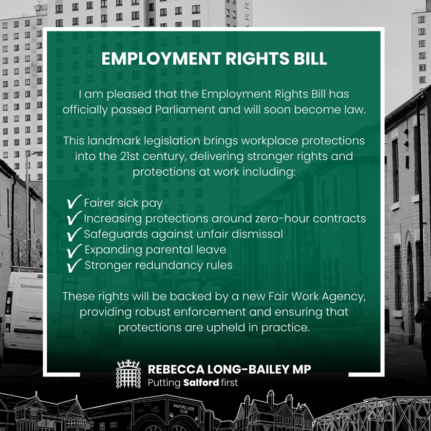 I am pleased that the Employment Rights Bill has passed Parliament and will soon become law. It will mean fairer sick pay, stronger protection from zero-hour contracts and unfair dismissal, improved parental leave and tougher redundancy rules, all backed up by enforcement through a new Fair Work Agency. This is a significant step towards making work more secure and treating people with the dignity and fairness they deserve.
