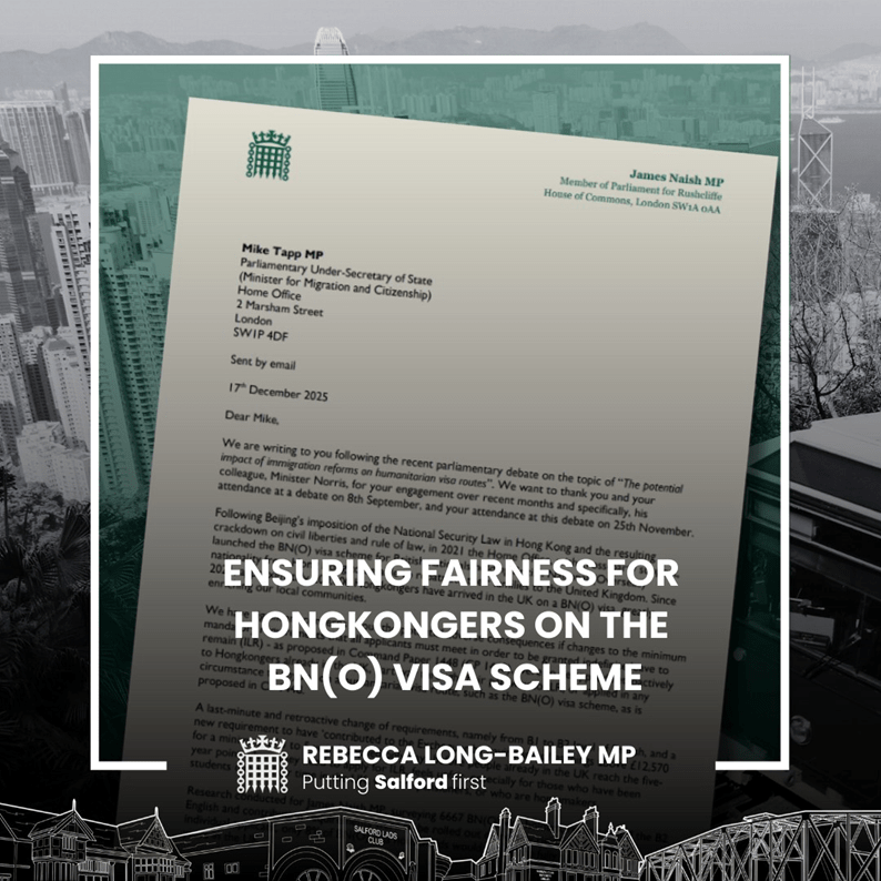 I have joined MPs from across Parliament in writing to Ministers about proposed changes to Indefinite Leave to Remain rules, calling for fairness and protection for Hongkongers on the BN(O) visa route. We made clear that there must be no retroactive rule changes, and that common-sense exemptions are needed so humanitarian visa routes remain true to their purpose. People who came to the UK in good faith, often fleeing repression, deserve certainty, fairness and compassion, not shifting goalposts. Read the letter in full here.