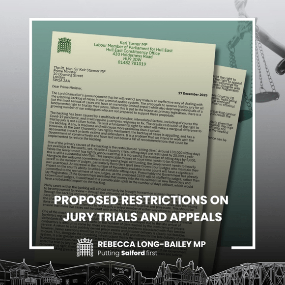 I co-signed a letter with Labour colleagues urging the Government to pause and rethink concerning proposals that would limit jury trials and restrict appeal rights. These plans risk undermining a fundamental safeguard in our justice system without addressing the real causes of court backlogs. I am clear that the right to be tried by a jury of your peers is a cornerstone of our democracy, and any changes must strengthen justice, not weaken it. Read the letter in full here.