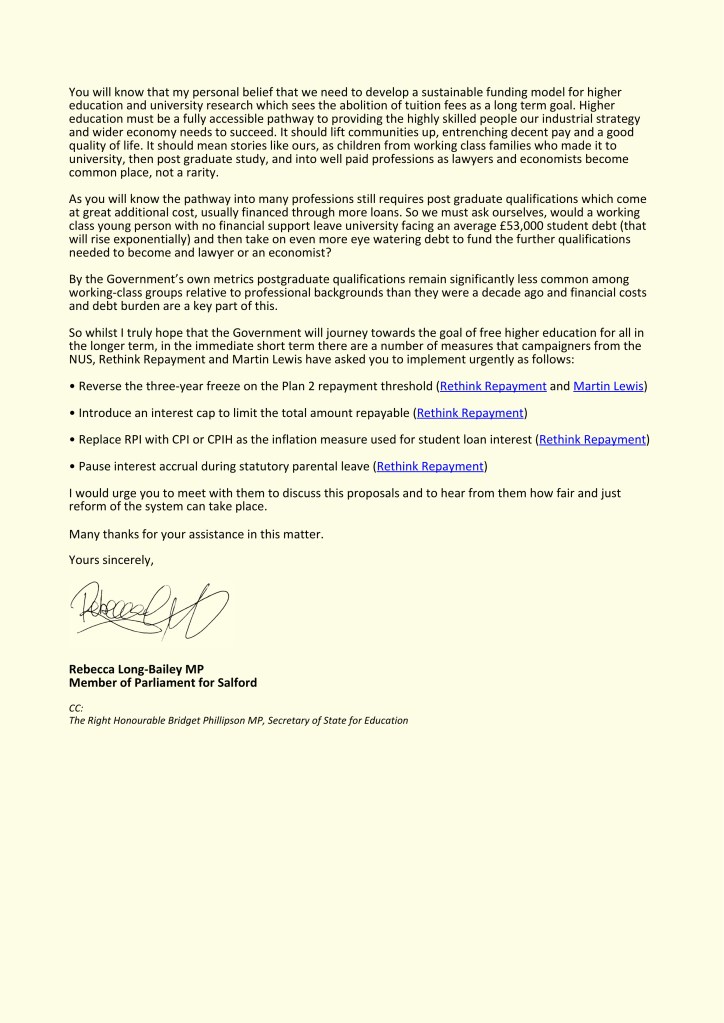 Salford MP, Rebecca Long-Bailey, whilst calling on the Government to develop a sustainable funding model for Higher Education and university research which sees the abolition of tuition fees as a long term goal, is calling on the Chancellor to immediately reverse the three year freeze on the Plan 2 repayment threshold, and to meet with campaigners to implement wider urgent proposals to reform the broken student loans system.