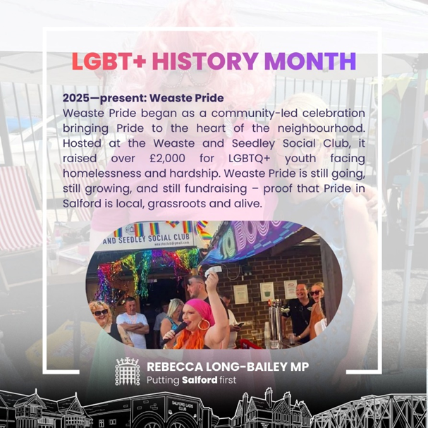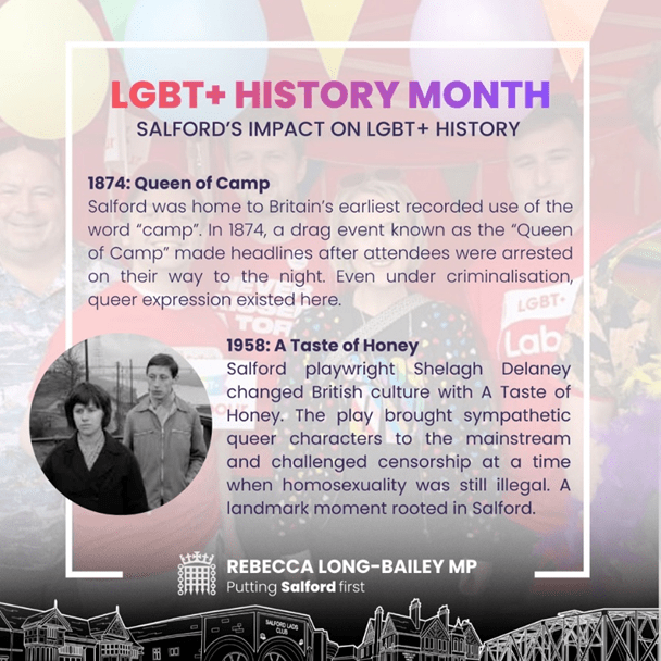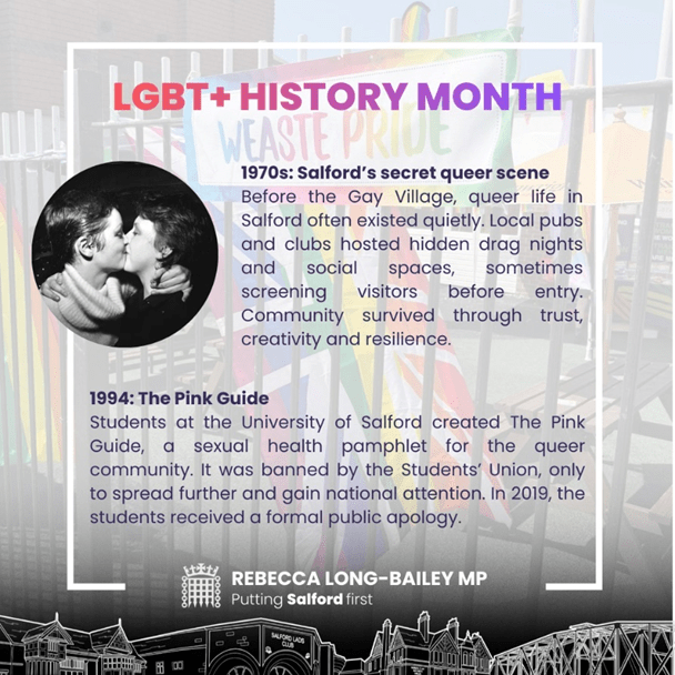 During LGBT+ History Month, we celebrate the rich heritage and lasting contribution of LGBT+ communities here in Salford, across the UK and around the world. From the defiant resilience of Salford’s early queer scene and the cultural impact of A Taste of Honey, to the creativity of Islington Mill and the grassroots energy of Salford Pride and Weaste Pride, our city has long played its part in advancing equality and visibility. I am proud of that history and of the vibrant community that continues to shape Salford today. I will always stand with LGBT+ people and continue working for equality, dignity and respect for all.