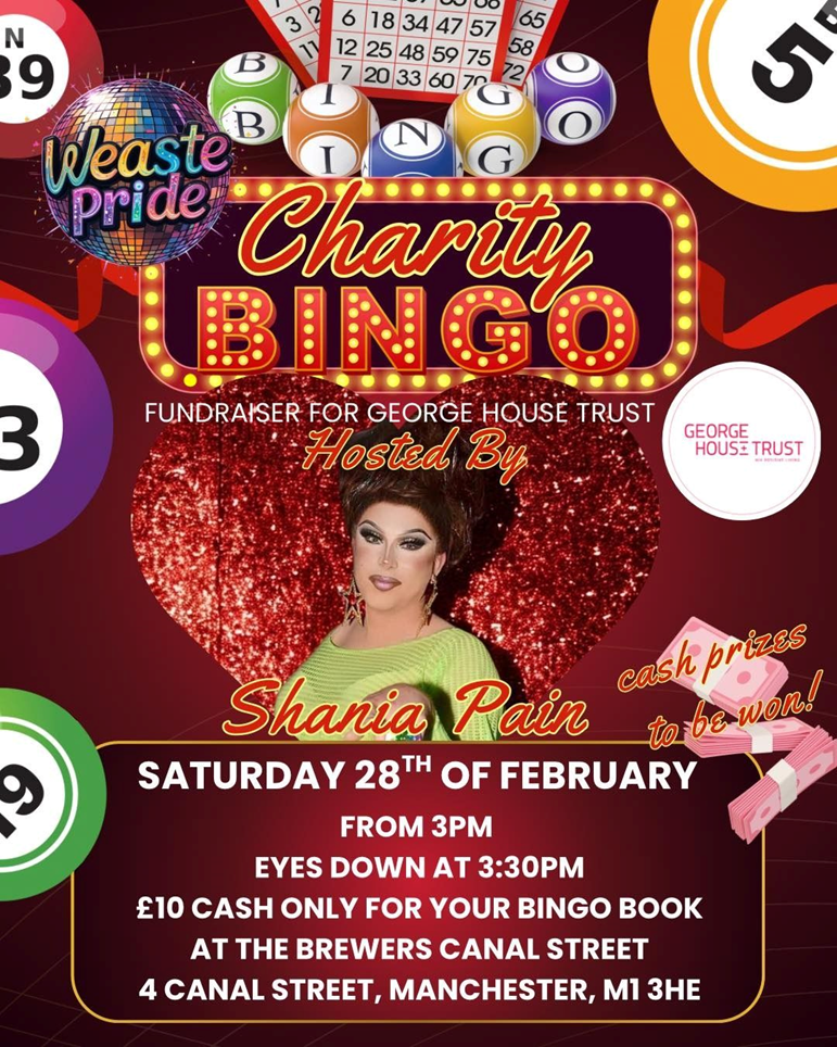 Get yourself down to The Brewers on Canal Street on 28 February to support Weaste Pride as they raise vital funds for George House Trust. Expect charity bingo, cash prizes and plenty of big laughs with Shania Pain hosting the afternoon. Doors open at 3pm, eyes down at 3.30pm, and it is £10 cash for your bingo book. It promises to be a brilliant afternoon in support of a fantastic local charity doing crucial work in our community.