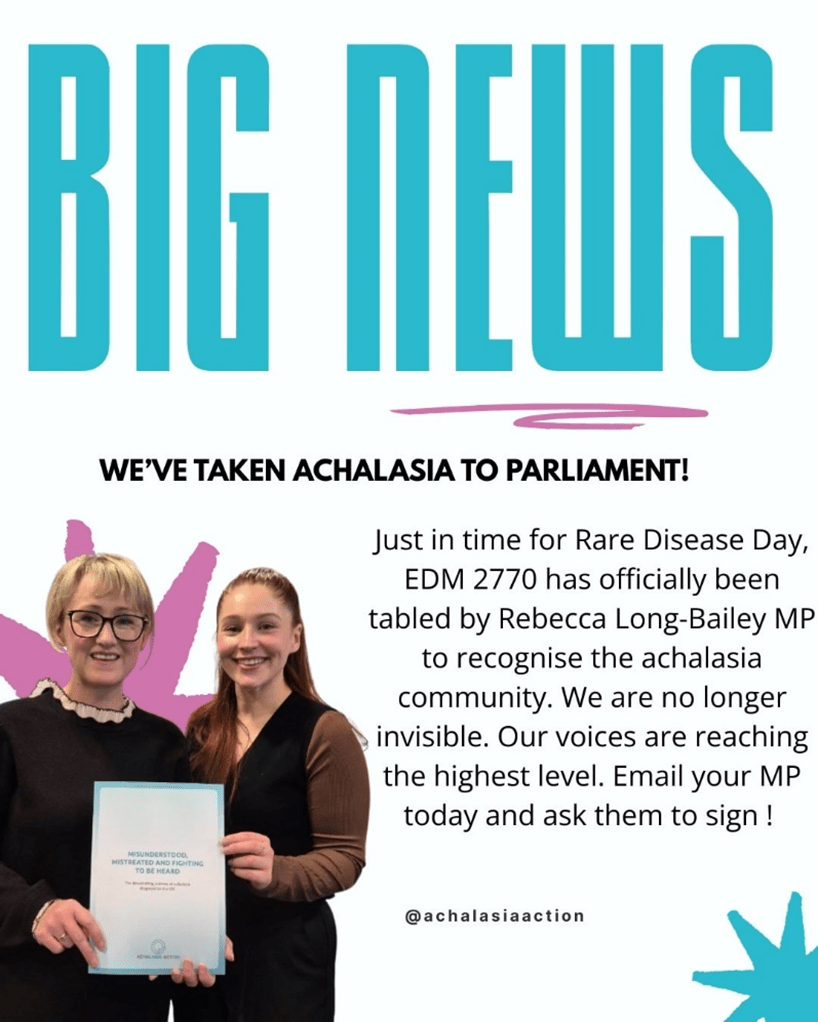 To mark Rare Disease Day on 28th February, I tabled a Parliamentary motion to recognise achalasia, a rare and serious swallowing condition affecting around 6,000 people across the UK. Achalasia can cause severe pain, malnutrition and profound impacts on both physical and mental health, yet far too many people face years of misdiagnosis, often being told their symptoms are anxiety, acid reflux or eating disorders. I pay tribute to Achalasia Action, the only UK charity dedicated solely to supporting those living with the condition, and welcome its powerful report Misunderstood, Mistreated and Fighting to be Heard, which highlights systemic delays in diagnosis and the disproportionate impact on women. The motion calls on the Government and NHS England to act on the report’s recommendations, improve professional awareness, reduce diagnostic delays and ensure that people living with rare conditions receive the timely care and support they deserve. Read the motion in full here.