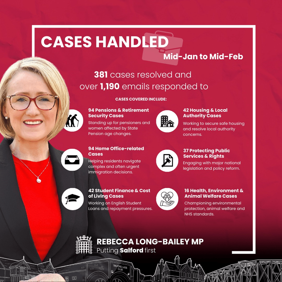 From pension injustices to urgent Home Office-related cases, housing concerns to student finance pressures, it’s been busy! 381 cases resolved and 1,190+ emails responded to in the last month. Always putting Salford first.