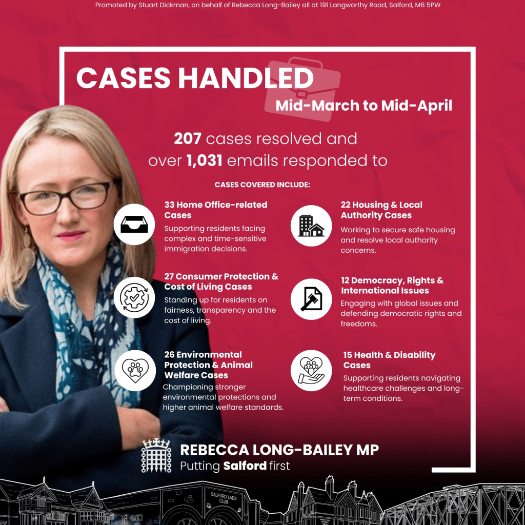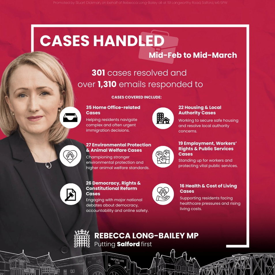 From housing to workers’ rights, environmental protection and healthcare, I’m working every day to support residents across Salford. Always putting Salford first.