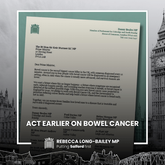 I joined colleagues from across Parliament in writing to the Prime Minister to call for action, including improving access to screening, raising awareness of symptoms, and ensuring faster referrals so cancers are caught earlier. Early detection saves lives, and we must do more to ensure people receive timely diagnosis and treatment, rather than reaching crisis point before getting the care they need.